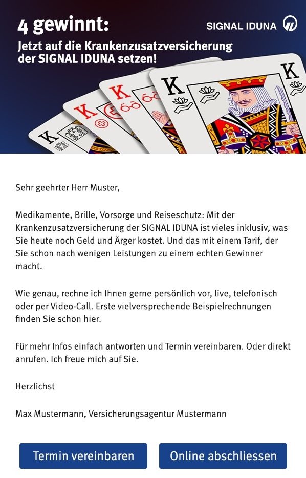 In der Flut von E-Mails, die täglich in Postfächern landen, braucht es das Besondere, um aufzufallen. Und den Besonderen: Als vielfach ausgezeichneter Dialog-Texter bin ich Ihr Spezialist für responsestarke E-Mailings und Newsletter.