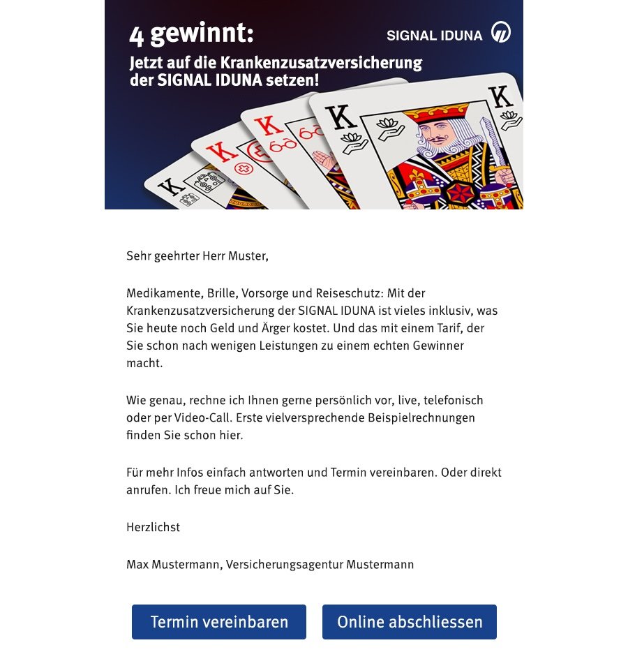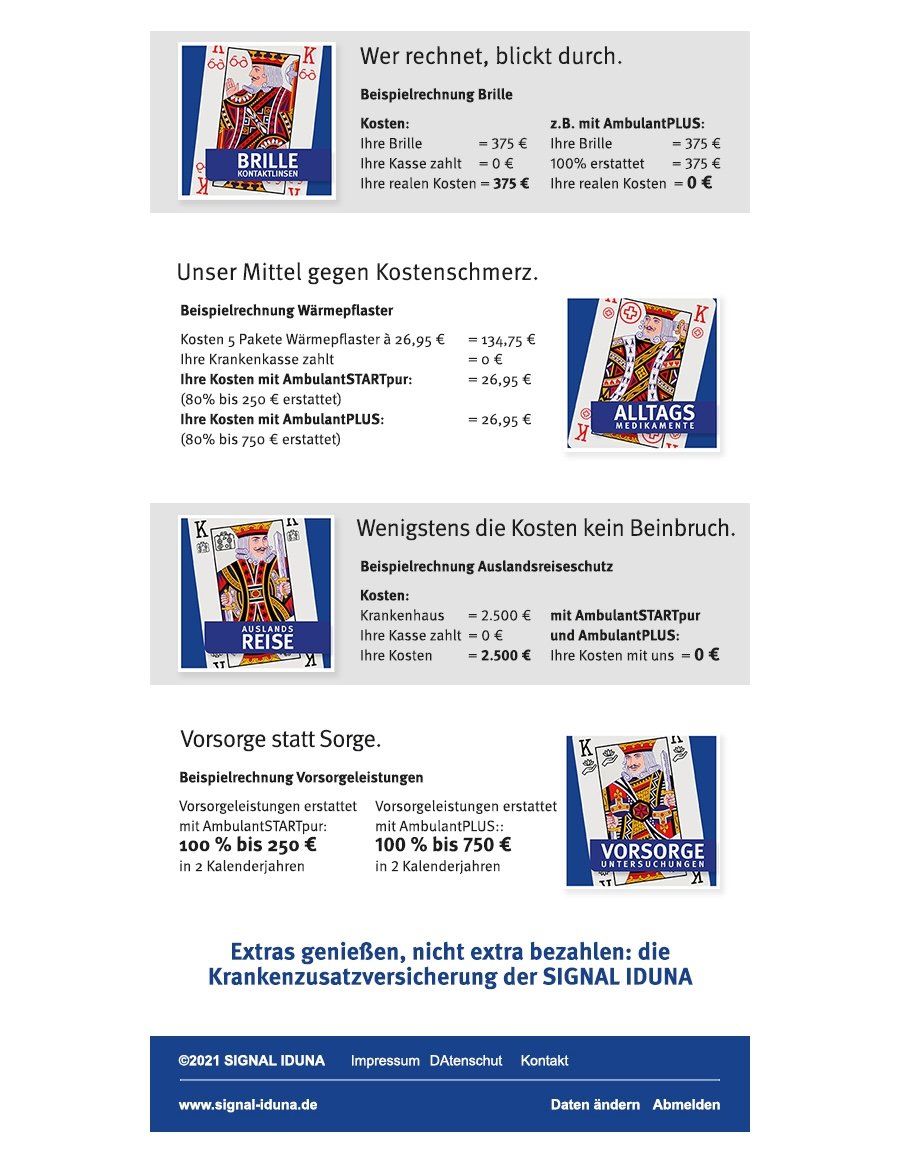 Idee: Mit einer Spielkarten-Analogie und witzigen Headlines erhöhe ich die Chance, dass die Empfänger sich mit dem eigentlich ungeliebten Thema Versicherung beschäftigen und die „königlichen“ Angebote anklicken.